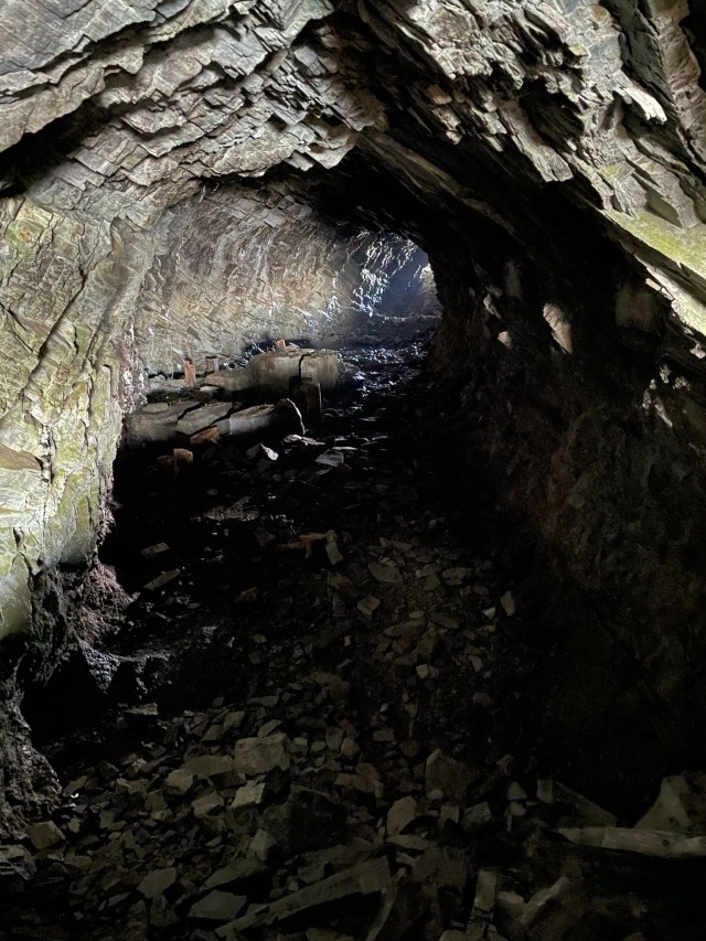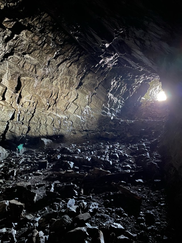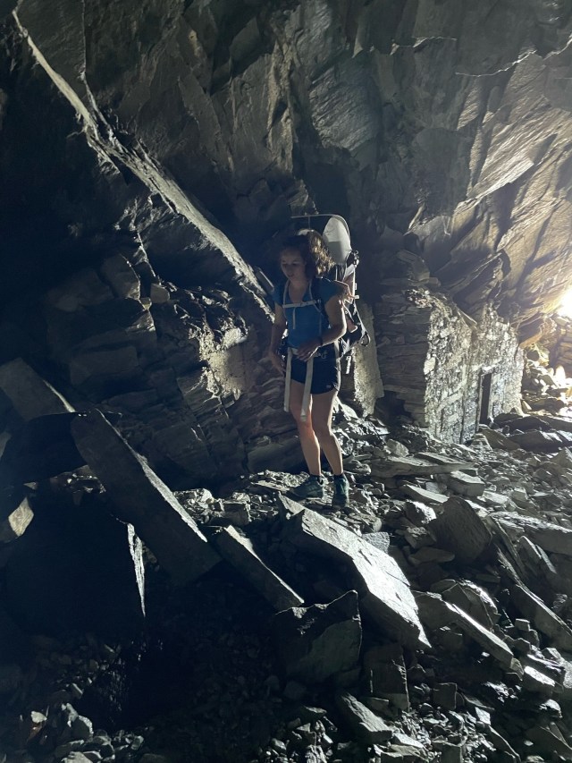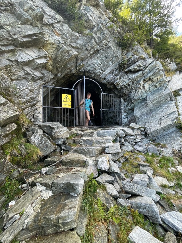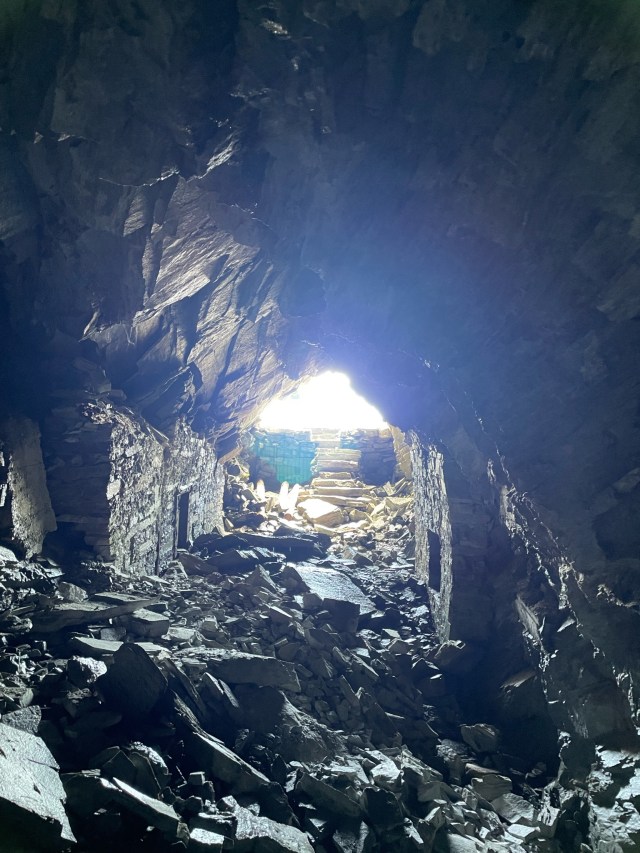 Tijdens onze lunchpauze raadpleegden we de All Trails-app om te kijken hoe we het beste verder konden wandelen. We geven er altijd de voorkeur aan om een rondwandeling te maken wanneer dat mogelijk is, in plaats van heen en weer te lopen. Op de kaart zagen we inderdaad een route langs de bergrug naast ons, die ons vervolgens via enkele kleine bergmeertjes naar beneden zou leiden en daarna terug naar het punt waar we begonnen waren. Het pad langs de bergrug was goed begaanbaar, redelijk vlak, maar wel erg smal. Terwijl we ons steeds dichter bij overblijfselen van een oud bivak bevonden, raadpleegden we de kaart in de app om te zoeken naar de afslag naar het bergmeertje. Vreemd genoeg zagen we geen duidelijk pad en de top naast ons, waar het bergmeertje achter moest zijn, leek behoorlijk hoog. We raakten even in de war, totdat we dichter bij de ruïnes kwamen en plotseling een tunnel zagen die dwars door de berg ging! Niet zomaar een nette, verlichte tunnel, maar een ruwe doorgang die in de berg leek te zijn geblazen, pikdonker en bezaaid met rotsblokken!