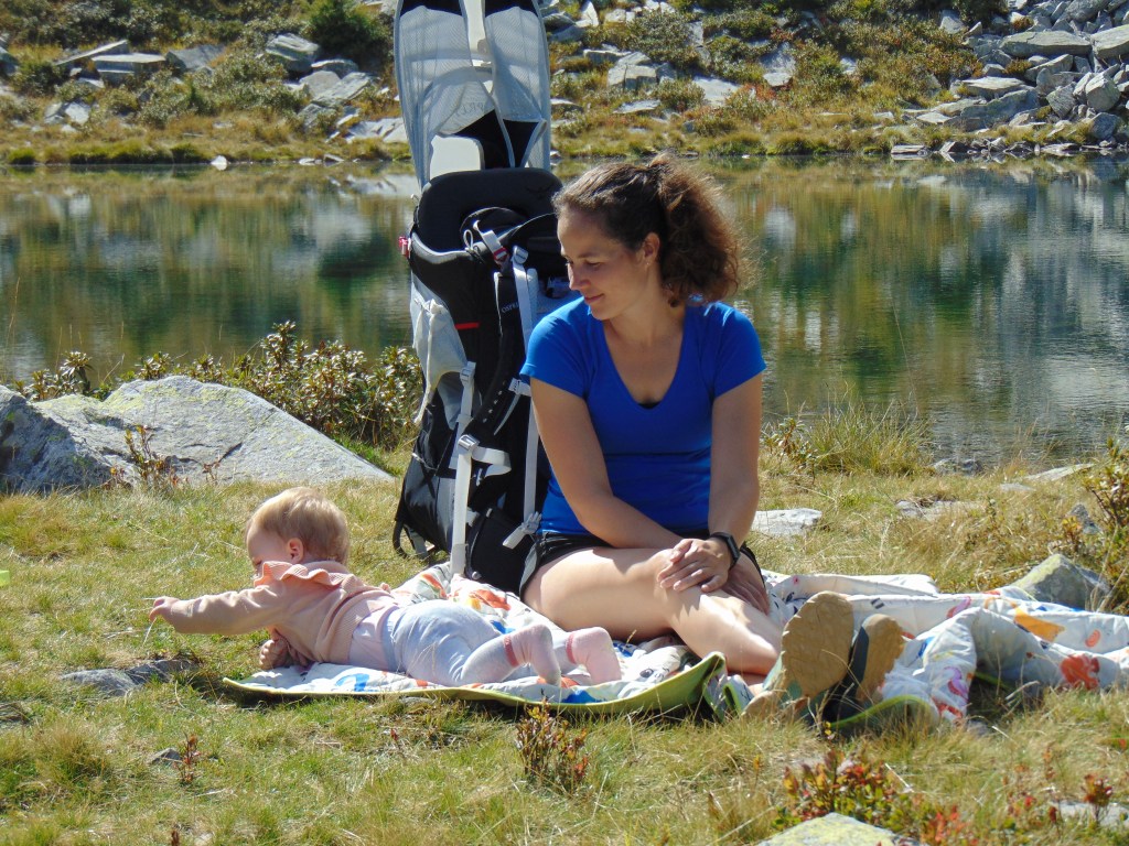 Aan de andere kant van de tunnel, na onze doortocht, zagen we het kleine bergmeertje al onder ons liggen. Het pad naar beneden was nogal steil. Bij het meertje spreidden we ons picknickkleed uit en genoten we van een heerlijk lange pauze. Lúa kon lekker rondkruipen, en de omgeving was zo fotogeniek dat we niet konden nalaten om talloze foto’s te maken.