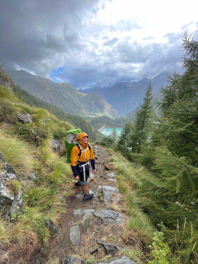 Uiteindelijk zorgde de regen voor een bijzondere sfeer; het gaf ons echt een gevoel van ‘alleen op de wereld’. We liepen nu hoog boven het meer, dat nog steeds een opvallend knalblauwe kleur had, vooral omdat de zon af en toe tussen de wolken door piepte. De luchten vertoonden een prachtig spel van wolken. Het grappige is dat je vooraf nooit zin hebt in regen. Maar toen het eenmaal zo was, hebben we er eigenlijk heel erg van genoten, juist omdat het zo bijzonder was. Zelfs Lúa vond het prima in haar ‘tentje’ op papa’s rug. Met slecht weer besef je des te meer hoe belangrijk goede schoenen met stevige zolen zijn. We hadden echt grip nodig op de gladde rotsen, en met gewone sneakers waren we waarschijnlijk meerdere keren uitgegleden!