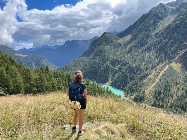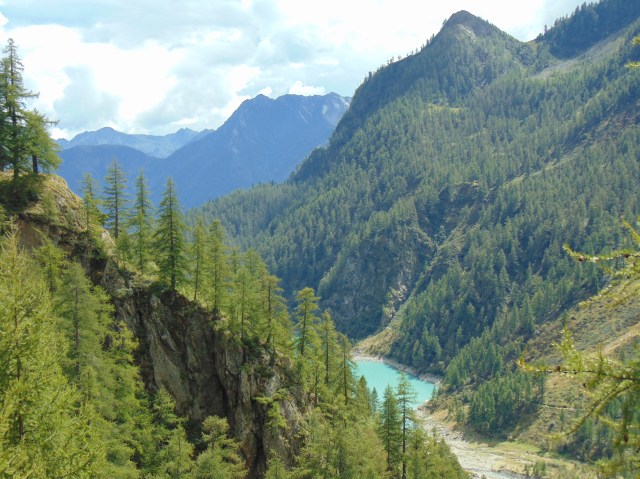De wandelroute is goed aangegeven met borden die ‘Giro Lago’ aanduiden, wat staat voor de ronde om het meer. Wij besloten om de route met de klok mee te volgen. Hierbij steek je eerst de dam over. Het eerste deel van de route is vrij vlak, waarbij je relatief dicht langs het meer loopt en geniet van een adembenemend uitzicht over het meer en de omliggende bergen. Dit gedeelte van de wandeling was extra genieten doordat we heerlijk in het zonnetje liepen, waardoor het meer nog blauwer kleurde.