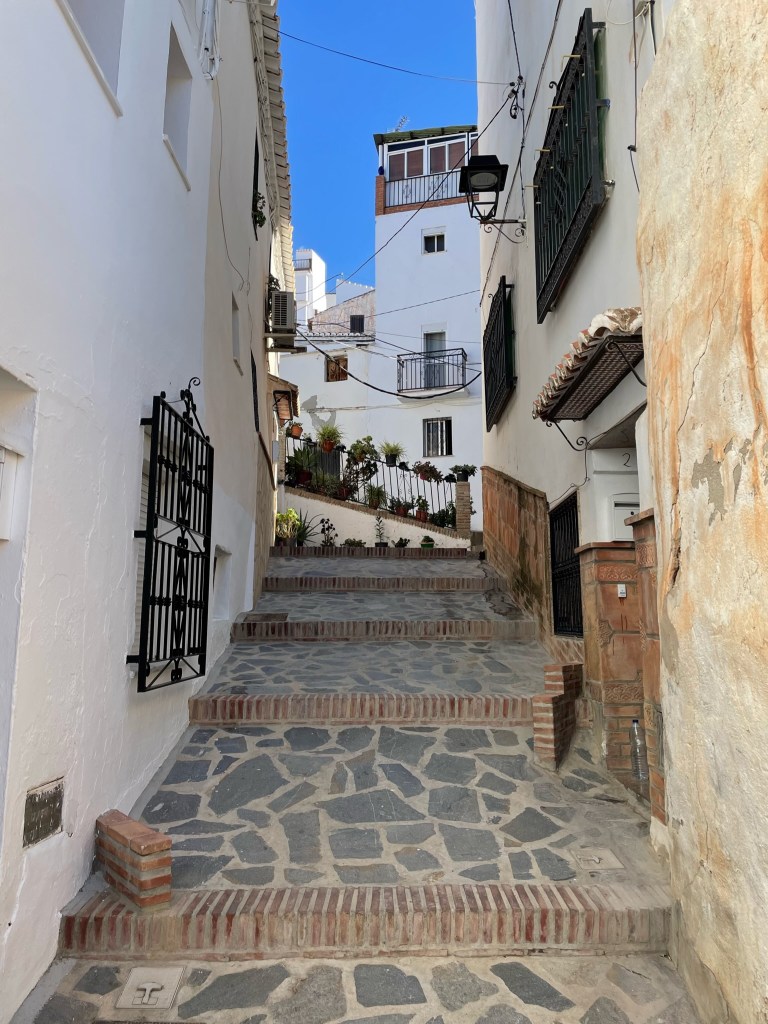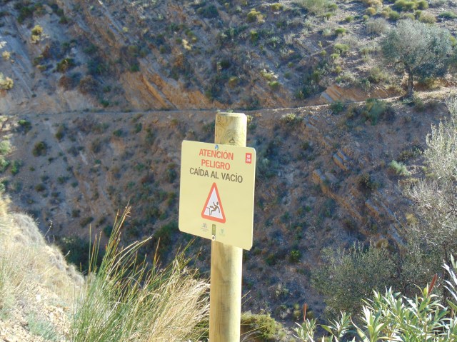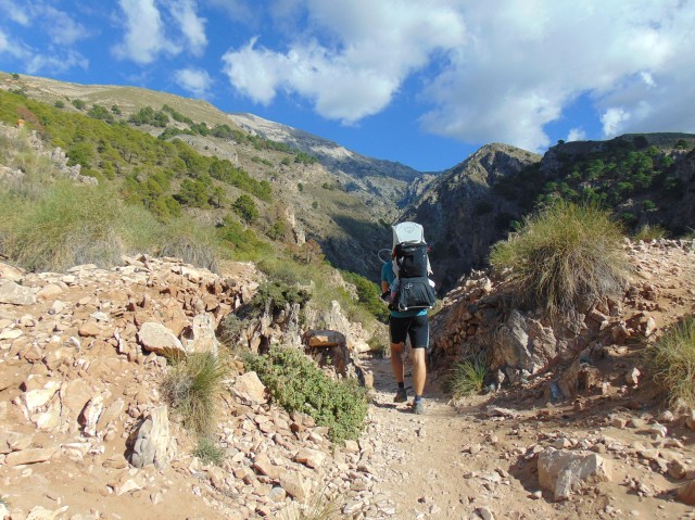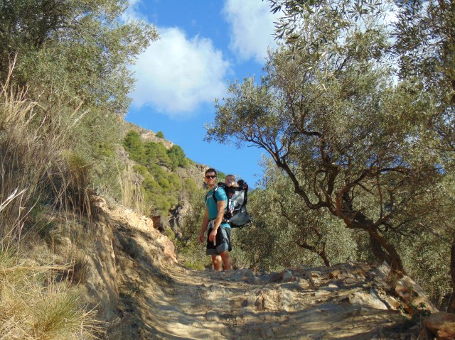 Vanaf de parkeergarage maakten we een korte klim door kleine, schattige straatjes naar het begin van de wandeling. Canillas de Aceituno is een van de ‘witte dorpjes’ die deze regio kenmerken. We navigeerden door de smalle straatjes met behulp van AllTrails omdat we geen bewegwijzering zagen om de route te vinden. Gelukkig stond er bij de start van de wandeling een duidelijke kaart met instructies. Hoewel er een waarschuwing was dat de route alleen geschikt was voor kinderen van 8 jaar en ouder, negeerden we dat, aangezien Lúa comfortabel in haar rugdrager zat. Pas later op de route begrepen we de reden achter deze regel: hoewel de route over het algemeen eenvoudig en vlak is, zijn er op sommige plekken behoorlijk diepe afgronden aan de zijkant!