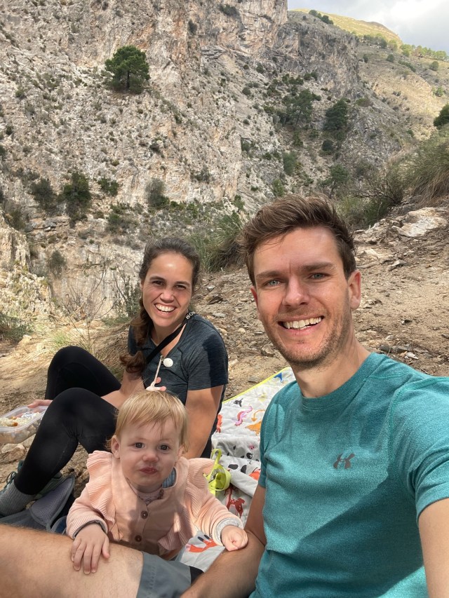 Aan de overkant besloten we het pad te vervolgen naar de plek waar we eerder mensen zagen staan. Op dat moment begon Lúa een beetje te protesteren. Terwijl Nabria het pad verkende, besloot ze dat het misschien toch wat te ruig is langs de afgronden. We daalden een stukje terug naar beneden en vonden een redelijk vlak en veilig plekje om ons picknickkleed uit te spreiden en een broodje te eten.