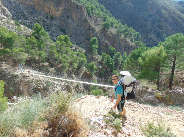 Bij de afslag naar de brug zelf (voor deze moet je weer een aardig stuk naar beneden klimmen), kozen we ervoor om nog een klein stukje langs de berg te volgen. Hier wordt het landschap ruiger en indrukwekkender, en het pad volgt eigenlijk de bergwand langs de kloof. Maar naarmate we verder gingen, werd ook het pad ruiger, en de afgronden bleven aanwezig. Met Lúa op onze rug besloten we dat het beter zou zijn om niet verder te lopen. Aan de overkant zagen we ook mensen staan, dus besloten we de brug over te steken en het pad aan de andere kant te verkennen.