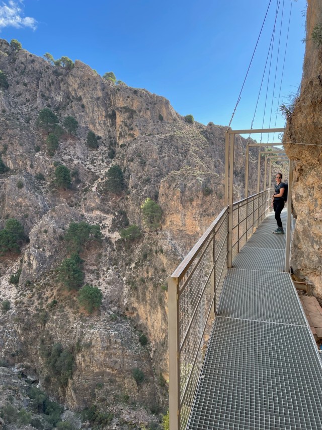Een paar bochten verder wordt de route extra beveiligd met vlonders en hekken, vergelijkbaar met wat je zou tegenkomen bij de Caminito del Rey. Langzaam kwam de hangbrug El Saltillo onder ons tevoorschijn. Op een bepaald punt zagen we een auto op de weg onder ons wegrijden, en we konden niet anders dan lachen, omdat de kaart suggereert dat we onze auto misschien dichterbij hadden kunnen parkeren. De klim vanaf daar is echter wel een stuk steiler, en de officiële route begint dan ook echt bovenaan in het dorp.