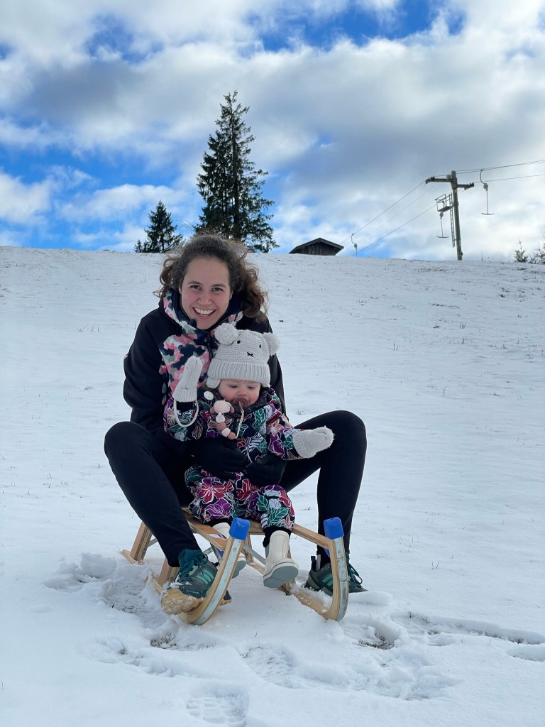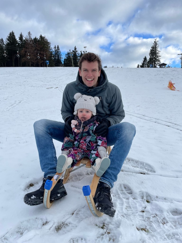 Waar geskied kan worden, kan natuurlijk ook gesleed worden! Een aantal pistes heeft zelfs speciale sleepliften, waar je op kunt zitten en met je slee de piste af kunt glijden. Dit is fantastisch voor kinderen die (nog) niet kunnen skiën. Een van die pistes ligt onderaan de Kahler Asten. Helaas was de lift officieel niet open vanwege beperkte sneeuwval, maar dat mocht de pret niet drukken. Gelukkig hadden we onze eigen slee bij ons, en de laag sneeuw die er lag was precies genoeg om te kunnen glijden. Dus duwden we Lúa met slee en al de berg op. Ze vond het helemaal fantastisch en gilde van plezier!
