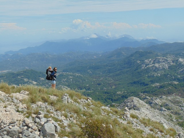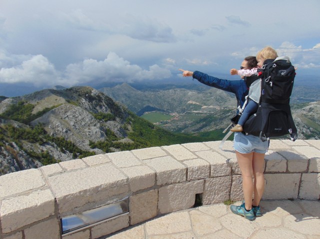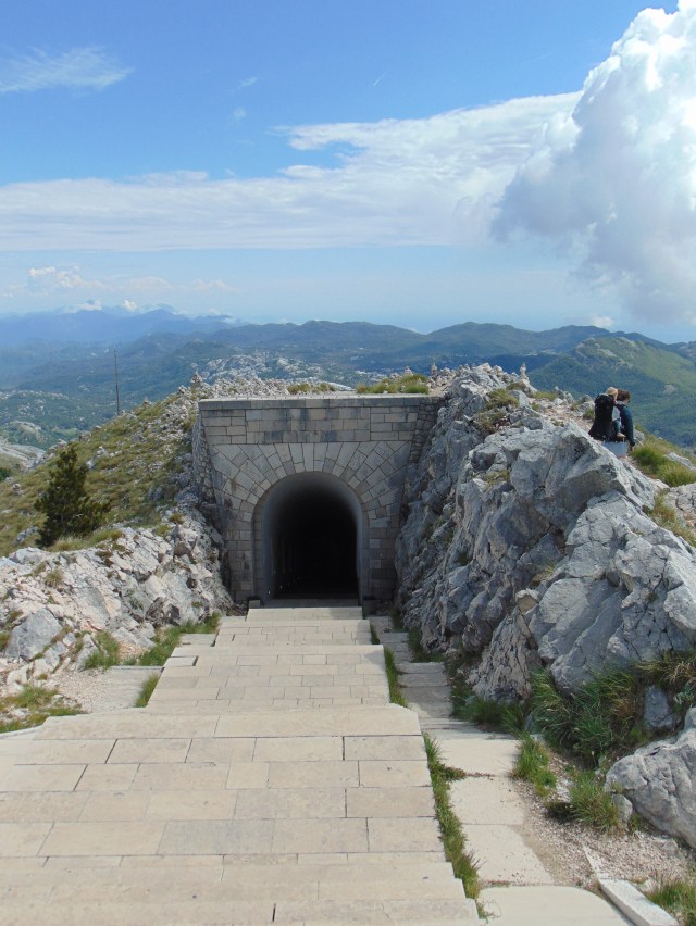 Na de lunch is het tijd om te vertrekken. Ook bij de ingang van het Mausoleum moeten we weer betalen, €8 per persoon en Lúa (die dan bijna 1,5 jaar is) krijgt gratis toegang. Er waren ooit twee toegangswegen: via de trappentunnel en de andere over de bergrug. De poortwachter vertelt echter dat de oude route over de bergrug deels is weggeslagen door de regen, dus is de trappentunnel nu de enige toegang. Hoewel 461 traptreden als heel veel klinken, is het eigenlijk heel goed te doen, zelfs met kleinere kinderen die zelf lopen. Wij dragen Lúa in de rugdrager, en onderweg zijn er meerdere uitzichtpunten waar je even de tunnel uit kunt. Helemaal bovenaan de trappen en uit de tunnel kom je bij het mausoleum, wat echt indrukwekkend is. De bewaker daar vertelt ons dat de standbeelden helemaal uit graniet zijn gemaakt. We lopen verder, waar je ook naar de graftombe van Petar II Petrović-Njegoš kunt gaan, maar als je hier niet heen wilt, kun je gewoon voorbij lopen. Achter het mausoleum is een uitgang waar je over een goed aangelegd stenen pad naar een prachtig uitzichtpunt loopt. Op dit punt heb je echt een waanzinnig uitzicht op de wijde omgeving, je kunt zelfs in de verte het Skadarmeer zien liggen.
