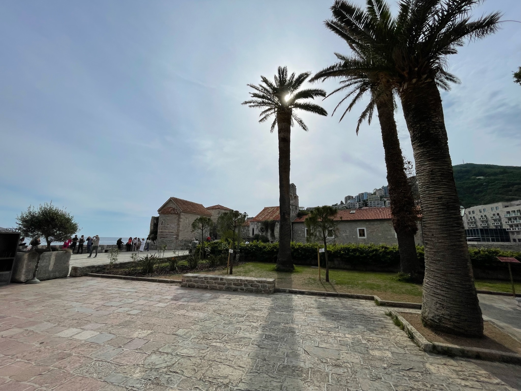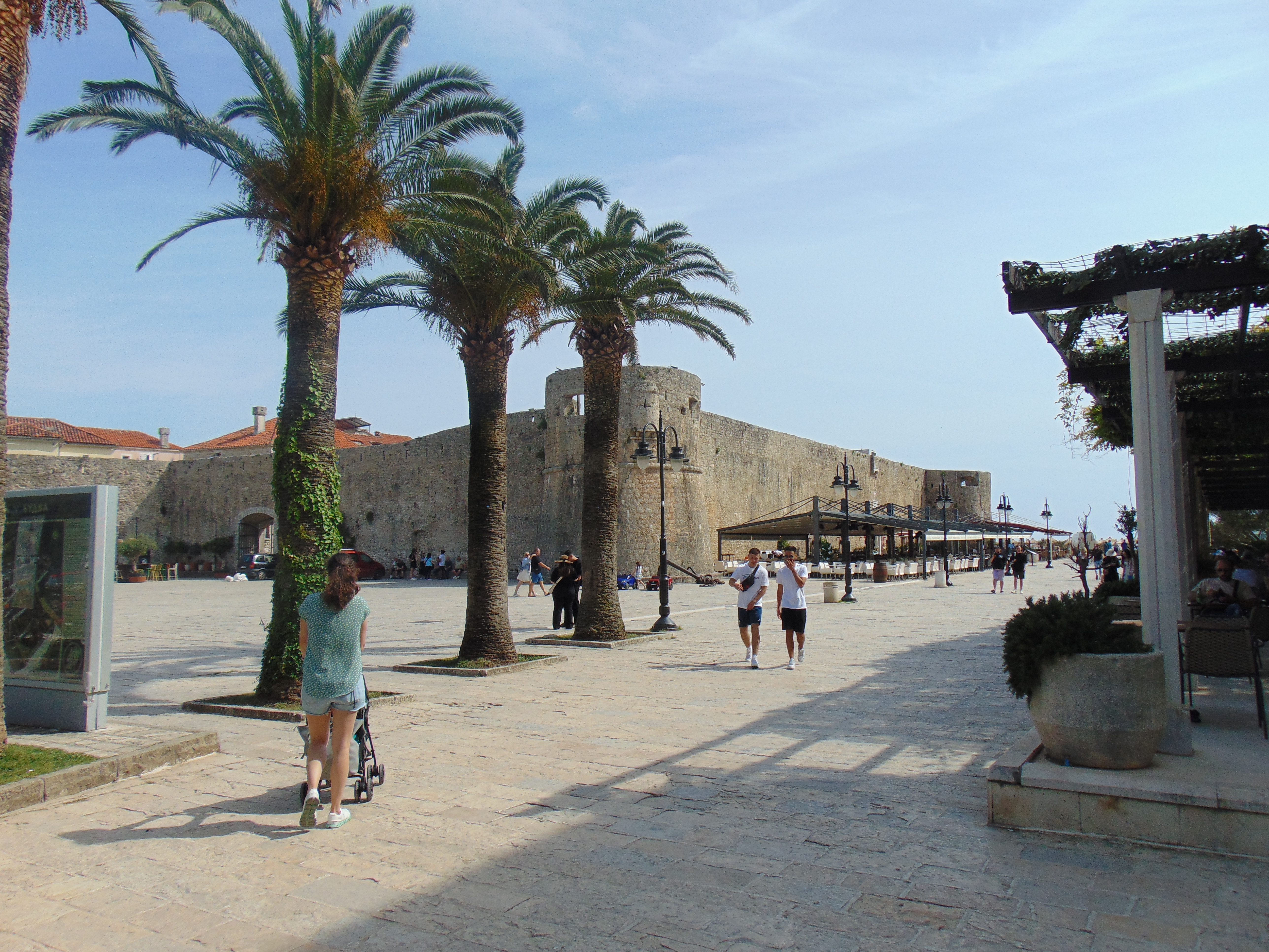 Omdat we inmiddels zo ver waren afgedaald naar zeeniveau, gokten we erop dat we ook in Budva wel een heel eind zouden komen met de buggy. De parkeerplaats bevond zich achter grote kantoorgebouwen en via een rolstoel- en buggyvriendelijk voetpad liepen we richting de oude stad (Stari Grad) van Budva. We kwamen aan op een groot plein waar we de imposante stadsmuren zagen staan. We staken het plein over en liepen de stadspoorten door.