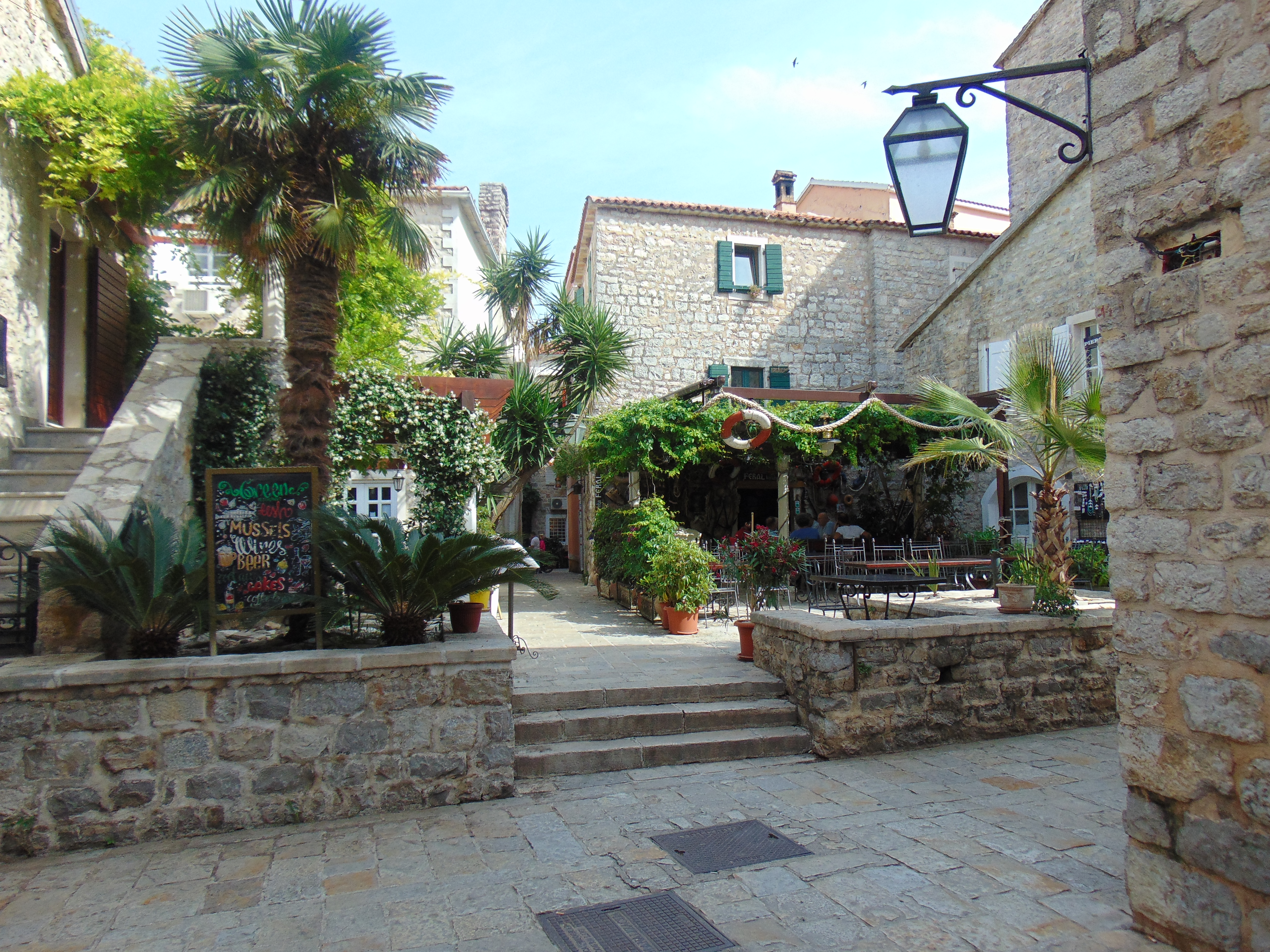 En toen waren we op slag een beetje verliefd! We waanden ons in een compleet andere wereld, alsof we een stapje terug in de tijd hadden gedaan. Het oude stadje is nog helemaal intact en binnen de stadsmuren vind je schattige straatjes en kneuterige pleintjes. Vergeleken met Kotor is het hier nog een oase van rust (wij waren er in mei). De gok om de buggy mee te nemen was goed; Budva lijkt echt helemaal buggyproof! Het lijkt erop, dat de hele stad bereikbaar is via een route die waarschijnlijk vroeger voor kooplui met hun karren geschikt was. Want als je niet wilt, hoef je nergens de buggy op te tillen en slinger je simpelweg de hele stad door.