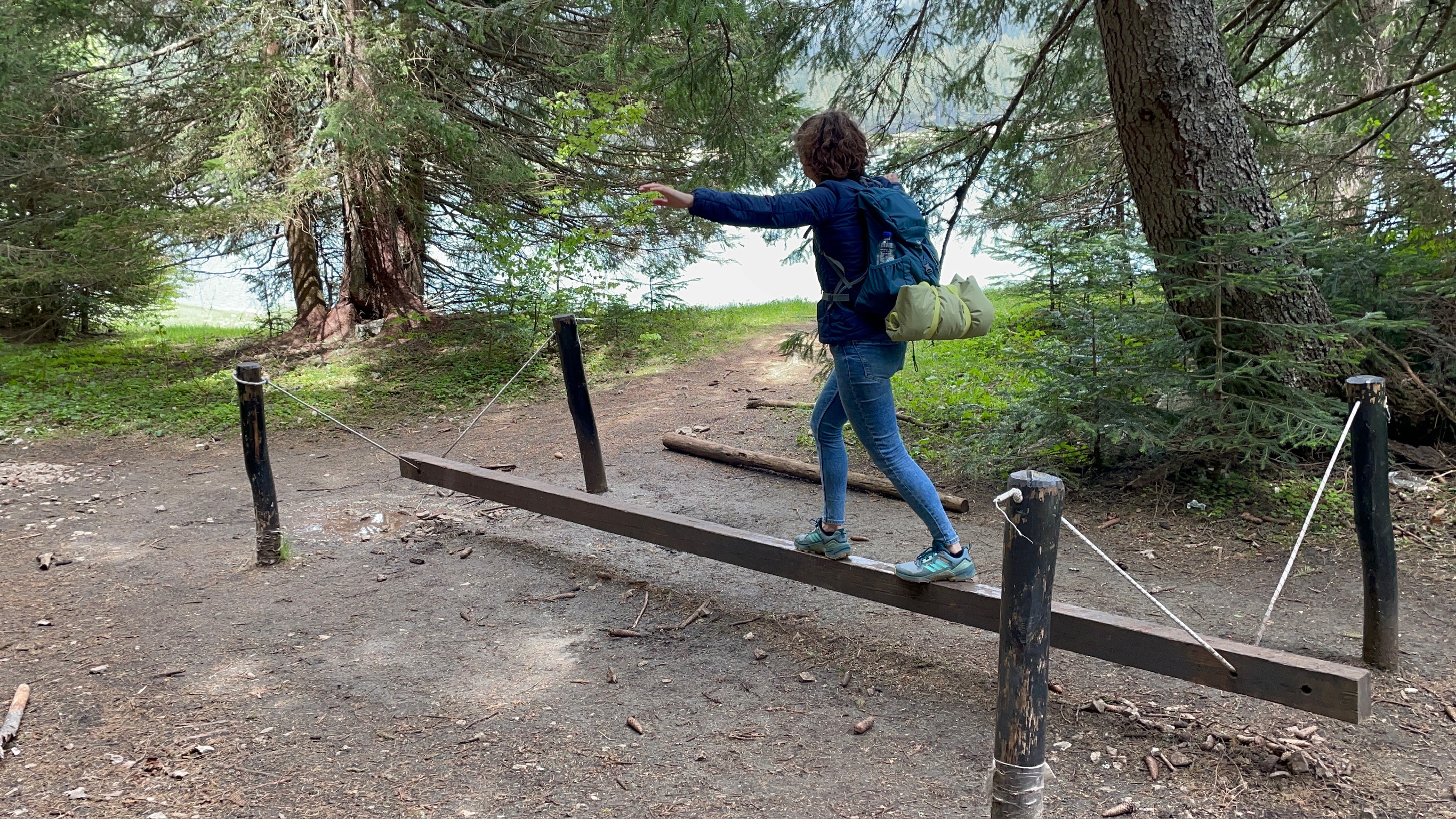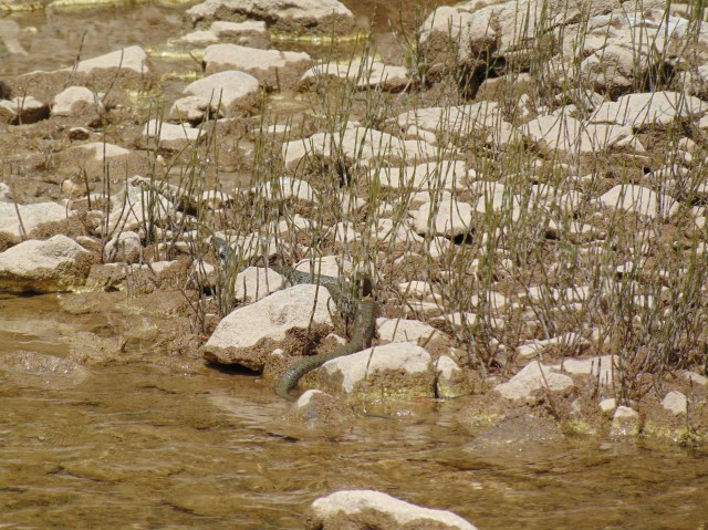 Precies op het moment dat Riccardo zijn eerste stappen over de stapstenen wilde zetten, slaakte hij een kreet. Vlak voor hem schoot een kleine slang weg! Snel probeerden we onze camera te pakken om nog een foto te maken. Dit lukte nog net, en daarna verdween de slang snel uit het zicht. Later ontdekten we dat het een ringslang betrof; gelukkig is deze niet gevaarlijk! Toch is het altijd belangrijk om goed op te letten wanneer je in de natuur bent, vooral bij wilde dieren.